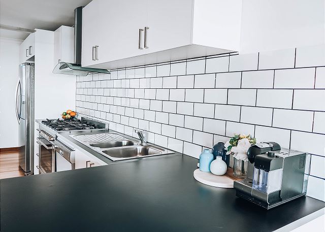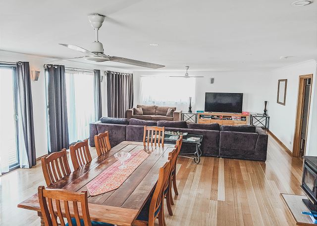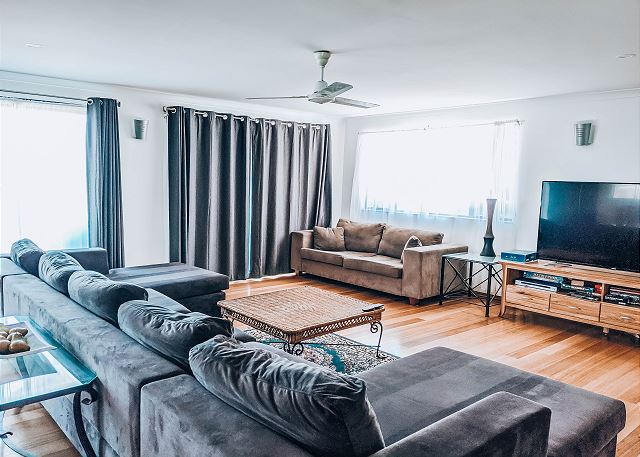 BUT, that’s not all there is to love about this home. Upstairs is bathed in natural light from floor to ceiling windows and sliding doors. A gourmet kitchen equipped with dishwasher and coffee machine (pods provided). An open plan living and dining area with a large table setting to cater for all and a large U-shaped sofa allowing plenty of room to kickback & relax after a long day in the sun.